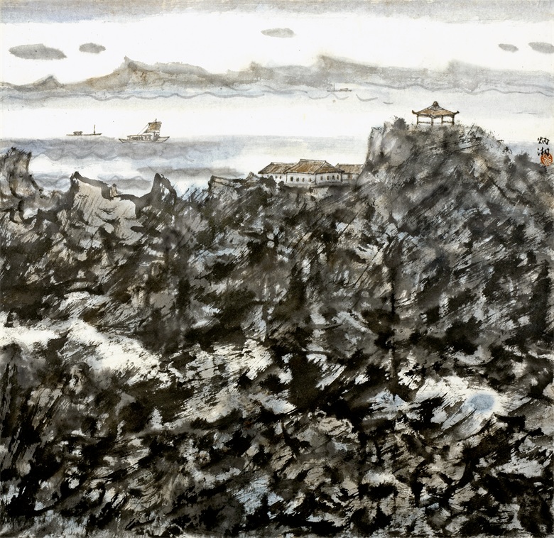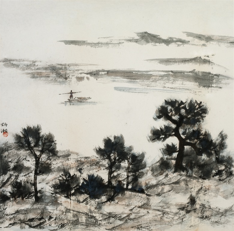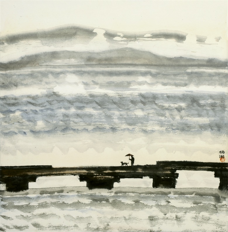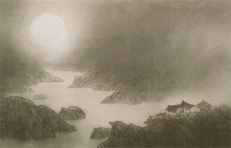 品读炳湘之作品,则情不自禁地为她的笔墨精妙而心动,精神上得到愉悦及享受。如《山里人家》《轻舟》《夕照》《渔》等之恬淡静谧,纯朴民心、淳厚乡情,比比皆是心境安适之一隅的世外田园,卸下世间红尘之喧嚣、嘈杂与纷争,回复心灵之淡泊平和,《云岭山居》《岭上》《山家》等作品,设色简净,晕染皴擦,近实远虚,肌理节奏,层次分明,画面幽深凝重,意境深远绵长。或许此乃炳湘心向往之“诗意栖居”及心灵归隐之所也!画中万千气象,早已脱离古人窠臼,实为大虚大实、浑莽氤氲之灵构,耀动的点线、团块的水墨与自然机巧的露白布虚相映成趣,表现了一种山川的腾虚之象,给人以“象外有象”的美感和无尽的遐思。一句话,笔参造化,已得山水真趣。