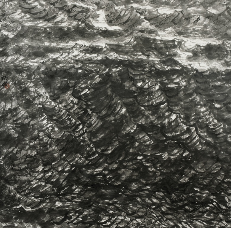 然而,激荡着旋律的笔墨则与具象、与意象形成强烈的对比。“夫象物必在于形似,形似须全其骨气,骨气形似皆本于立意而归乎用笔。”杨炳湘深谙其道,所以,她对线条的质感比较重视。纵览她近些年的作品,可以看到,她用线很多,也很畅快,纵横的、交错的,带着抽象的意味,老辣恣肆,酣畅淋漓。她用笔也很灵动,骨线与散锋并举,皴擦与点染生辉,自由的笔法交融着浑厚的墨韵,线条变化多端,墨韵妙趣横生,简洁之处,意态丰富,苍茫之处,浑然一体,笔性随着心象的变化而生发,笔意随着胸次的跌宕而升华,云烟显晦的高远、山涧流泉的深远、平湖陡坡的平远,或渲染、或渐变、或转换,过渡自然,交接和谐。也许正是因为笔的节奏,墨的韵律,才能演奏出如此美妙的视觉感观,才能给人一种“风、雅、颂”齐集,“趣、韵、理”俱生的审美体验,显然,这不是写实山水所能表现的境界,也不是“为写意而写意”所能呈现的品格,而是“因境变法,移情入画”,让“画为心象”,让“气格为上”的艺术真谛。